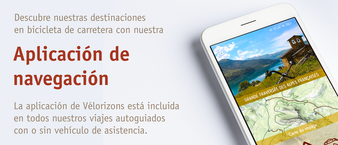 ¡Sigue tu ruta con confianza! Nuestra aplicación de navegación "Vélorizons" te permite descargar toda la información importante sobre tu viaje y ruta en tu smartphone y utilizar la guía integrada (visual y de voz) para navegar. Te proporciona información práctica sobre la ruta, perfiles de altimetricos de las etapas, información sobre los servicios reservados y contactos útiles al alcance de tu mano.