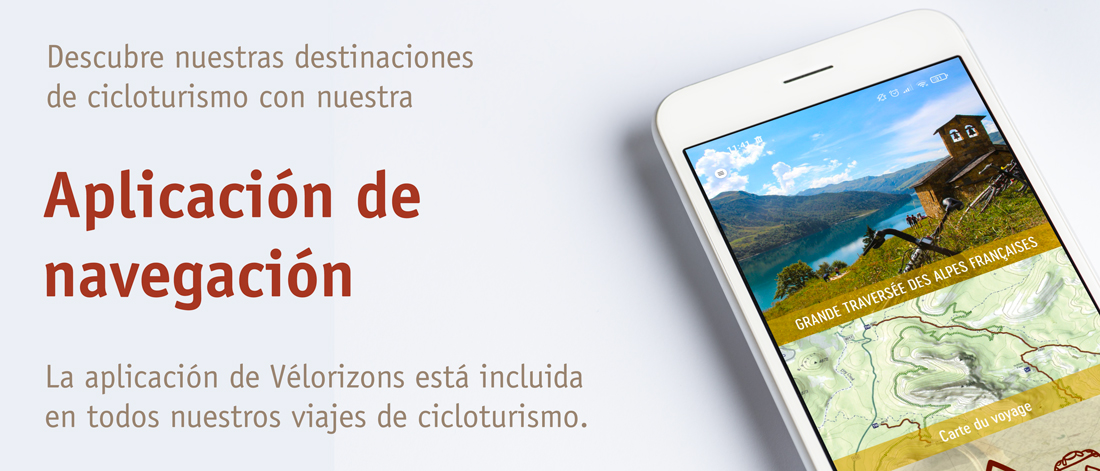 ¡Sigue tu ruta con confianza! Nuestra aplicación de navegación "Vélorizons" te permite descargar toda la información importante sobre tu viaje y ruta en tu smartphone y utilizar la guía integrada (visual y de voz) para navegar. Te proporciona información práctica sobre la ruta, perfiles de altimetricos de las etapas, información sobre los servicios reservados y contactos útiles al alcance de tu mano.